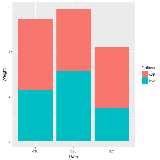 ggplot(cabbage_exp,aes(x=Date,y=Weight,fill=Cultivar))+geom_bar(stat="identity")