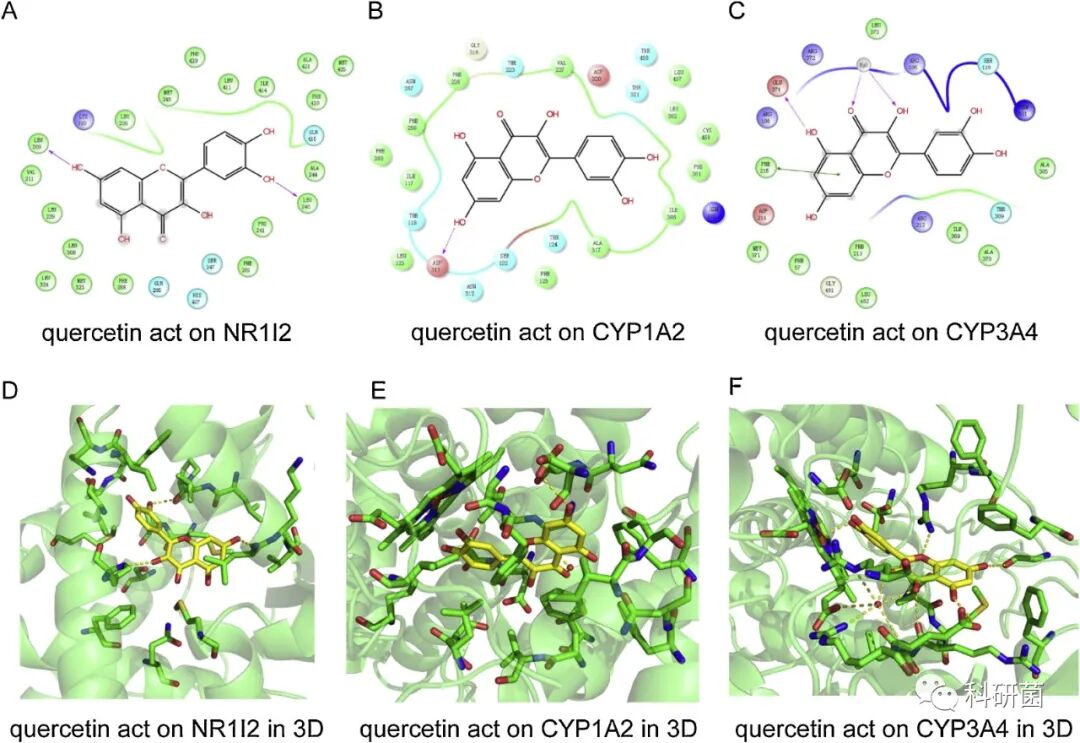 在NVIR组,NR1l2、CYP1A2、CYP3A4与预后和巨噬细胞M1有关。下图模拟了槲皮素与三种蛋白的相互作用,结果表明槲皮素可以较好地结合这三种蛋白,其中与CYP1A2的结合最理想,与NR1l2的结合效果一般。