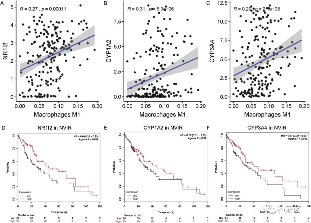 VIR组:NR1I2,CYP1A2和CYP3A4与VIR中的巨噬细胞M1相关性不大。它们均与巨噬细胞M1无关,高水平的靶标和患者的预后无关(p>0.05)。