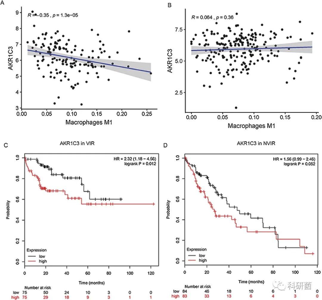 VIR组:AKR1C3与VIR中的巨噬细胞M1呈显着负相关(cor = –0.35,p<0.001);而在NVIR组中,AKR1C3和巨噬细胞M1之间的相关性非常低(cor = 0.064,p= 0.36)。