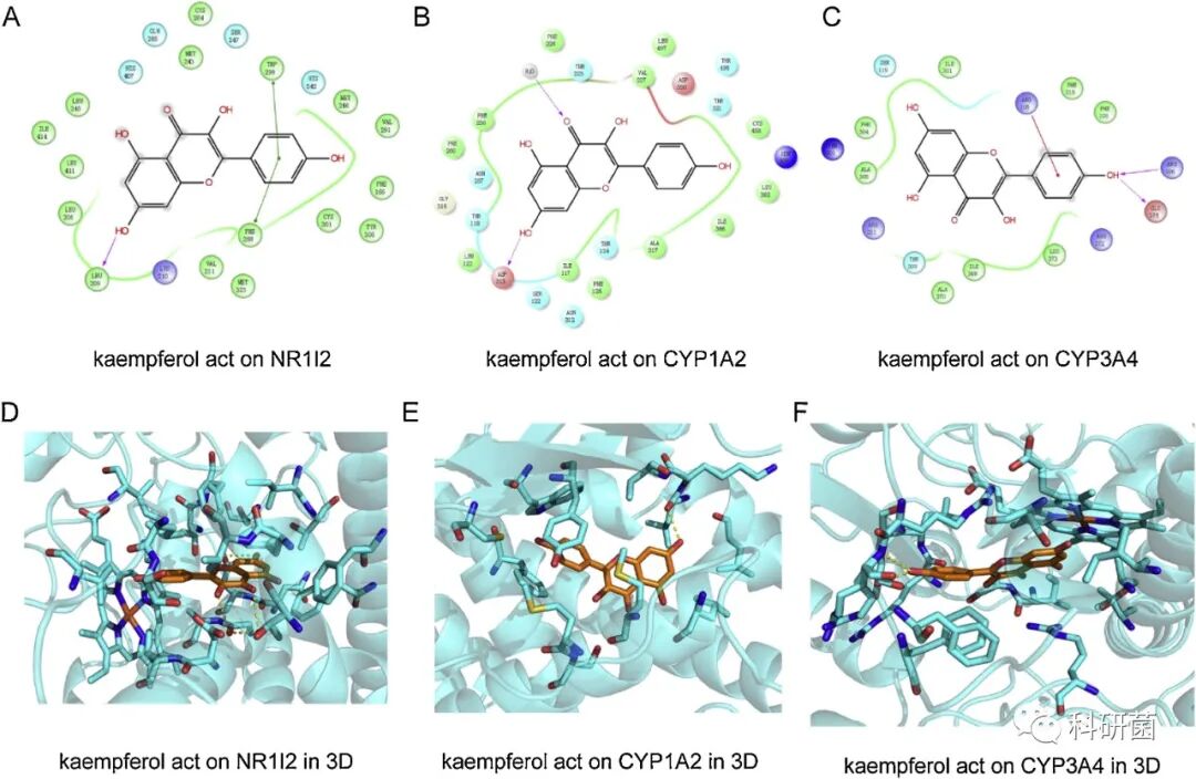 在NVIR组,NR1l2、CYP1A2、CYP3A4与预后和巨噬细胞M1有关。下图模拟了山奈酚与三种蛋白的相互作用,结果表明山奈酚可以较好结合这三种蛋白,对CYP1A2的包被作用最好。