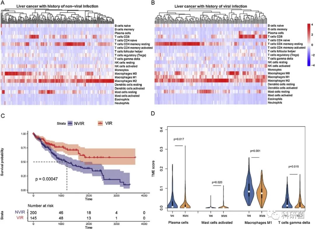 生存曲线:NVIR组的预后要优于VIR组。
