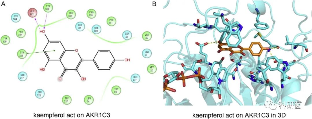 在VIR组,AKR1C3与预后和巨噬细胞M1有关。下图模拟了山奈酚与AKR1C3蛋白的相互作用,结果表明山奈酚可以很好地结合AKR1C3蛋白。