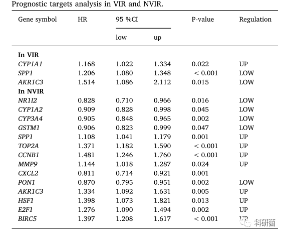 作者采用了多变量Cox回归分析基因的预后。其中3个基因是VIR组的独立因子,是高危因素(HR>1)。NVIR组14个基因与预后密切相关,14个基因与存活率显著相关。