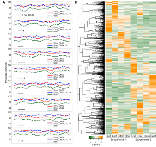 分别在两个基因组中找到195和170个同源区域,通过分析这些同源对可以表明两个物种都经历了全基因组复制事件,同时进一步研究显示,这两个物种可以被拆成两个亚型A(8条染色体)和B(11条染色体),二倍体祖先可以追溯的30.75 Mya。通过与其他瓜类比较及转录组数据同样验证这个结论。