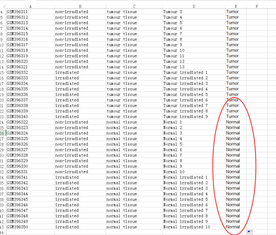 这套芯片数据为:GSE15781,这套芯片是直肠癌的数据,样本总共有42个,做差异分析之前我们都应该先看懂咱们自己的数据,如下图,从图中可以看出这套数据使用的平台是GPL2986,42个样本,分别有四类