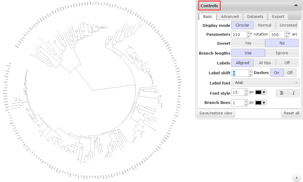 通过调整控制面板(Controls)中的参数可对进化树进行简单编辑,如调整图形模式(Display mode),物种字体(Label font),树枝粗细,颜色(Branch lines),甚至任意旋转进化树的方向(Parameters)等。比如下图就是经过简单编辑后产生的进化树图