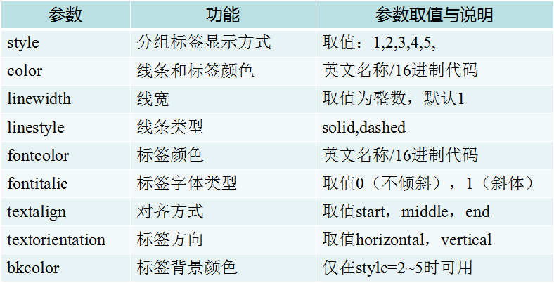 label—颜色的名称设置文字标签(text=label,必须)和格式参数(color可选)