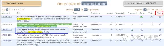 搜索到之后,点击一下最右边的Atlas,这样就可以利用其中的图形分析的小工具了。随便选一个肠癌的芯片吧,芯片编号就是E-MEXP-3715。