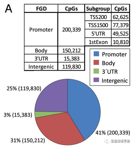 将整个基因组划分为Promoter, Body, 3UTR, Intergenic 4种区域,其中Promoter区又细分为TSS200, TSS1500, 5UTR, ‘1stExon’ 4种情况。