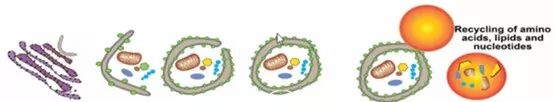 细胞质中的线粒体等细胞器首先被称为“隔离膜”的囊泡所包被,这种“隔离膜”主要来自于内质网和高尔基体;囊泡逐渐闭合最终形成双层膜结构,即自噬体,其大小约为 500 nm左右,囊泡内常见的包含物有胞质成分和某些细胞器如线粒体、内吞体、过氧化物酶体等;自噬体的外膜与溶酶体融合形成降解自体吞噬泡;由溶酶体内的酶降解自体吞噬泡中的内容物和内膜。