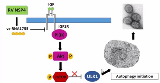 Yan Zhou等人研究发现,轮状病毒RV NSP4抑制IGF受体,阻断其与PI3K的结合,抑制了下游mTOR信号通路,解除了对ULK1的抑制作用,从而促进自噬,为病毒在宿主体内增殖提供条件。