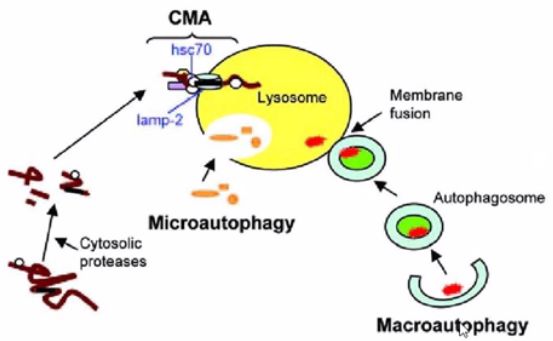 ③分子伴侣介导的自噬(CMA):一些分子伴侣,如hsp70,能帮助未折叠蛋白转位入溶酶体。