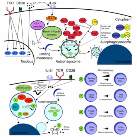T细胞的激活与TCR信号通路和CD28信号通路有关,TCR信号通路和CD28信号通路的激活能促进IL-2的转录表达,IL-2与其受体结合,激活自噬相关通路,可以将错误折叠的蛋白和一些细胞器降解,为细胞生存提供条件。