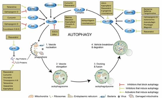 Bing Cui等人研究了多种中药成分在自噬调控中的作用,发现黄连素通过AMPK,抑制mTOR,进而促进细胞自噬;黄酮类药物主要与癌症相关,通过激活Beclin1,促进细胞自噬;多酚类药物在心血管疾病中应用较多,通过P38和LC3等靶点促进细胞自噬。