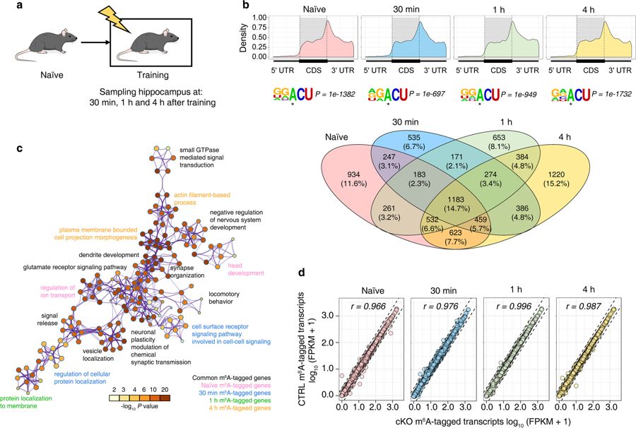 研究进一步比较了在早期学习过程中小鼠海马体的m6A修饰甲基化谱及基因表达谱的变化,发现m6A修饰在学习过程中是动态变化的,但其缺失并不会显著影响学习过程中的基因表达丰度。