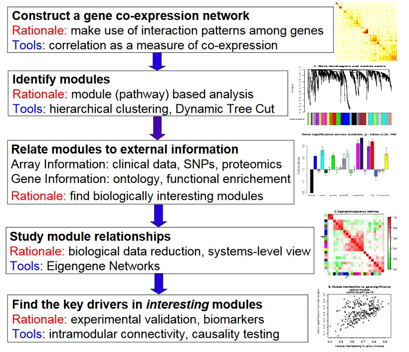 相比于只关注差异表达的基因,WGCNA利用数千或近万个变化最大的基因或全部基因的信息识别感兴趣的基因集,并与表型进行显著性关联分析。一是充分利用了信息,二是把数千个基因与表型的关联转换为数个基因集与表型的关联,免去了多重假设检验校正的问题。