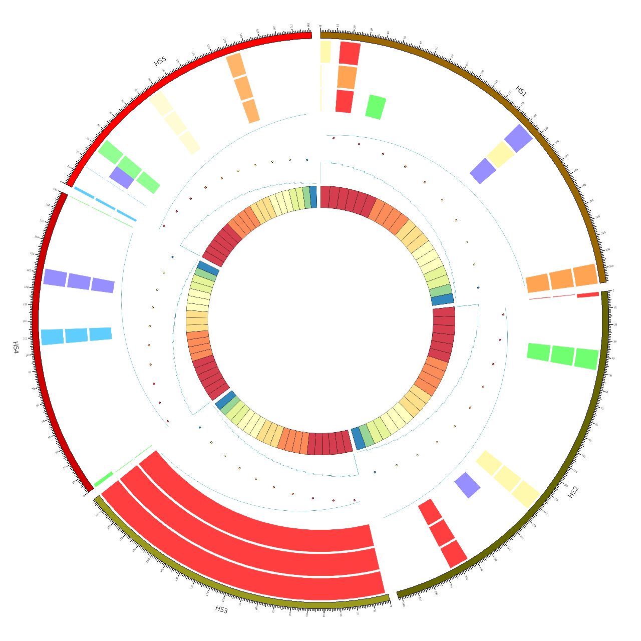 #ParentID    START    END    ATTRIBUTE #ParentID对应于karyotype文件的ID(第3列) #ATTRIBUTE列颜色的获取看前面两篇的介绍以获知有多少可用颜色 chr1 0 6422000 fill_color=vlyellow chr1 12447822 24895644 fill_color=vlpred chr1 136926042 149373864 fill_color=vlppurple chr1 236508618 248956422 fill_color=vlporange chr2 0 2421000 fill_color=vlpred chr2 36329031 48438708 fill_color=vlpgreen chr2 193754832 205864509 fill_color=vlpred chr2 133206447 145316124 fill_color=vlyellow chr3 59488668 69403446 fill_color=vlpred chr3 128892114 138806892 fill_color=vlpblue chr3 1800000 198295559 fill_color=vlpred chr4 0 2145550 fill_color=vlpgreen chr4 95107280 104618008 fill_color=vlpblue chr4 133150192 142660920 fill_color=vlppurple chr4 190000000 190214555 fill_color=vlpgreen chr5 0 1538259 fill_color=vlpblue chr5 27230739 36307652 fill_color=vvlpgreen chr5 72615304 81692217 fill_color=vvlyellow chr5 127076782 136153695 fill_color=vvlporange chr5 15382590 15392590 fill_color=vlpblue数值文件格式也一致,只是给定不同的type绘制不同属性的图,如线图、热图等。