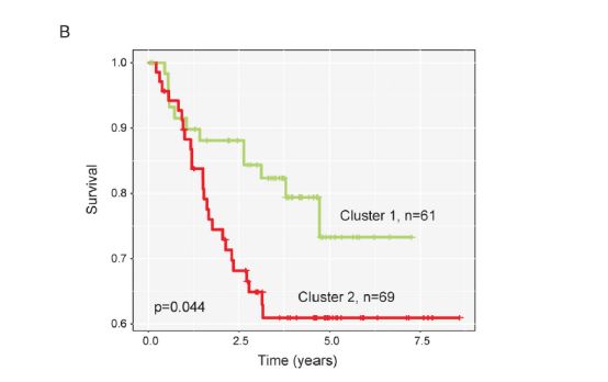 同样是聚类热图加生存分析比较,发现用8个lncRNA也能分开,而且也不错,同样的比较两Cluster的生存情况,当然结果还是不错啦。