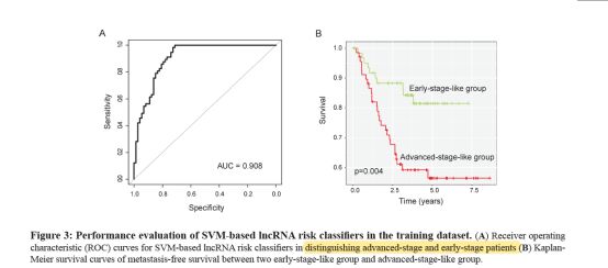 然后顺便比较了用差异基因分出的两组病人的生存分析(kaplan-meier),这种结果根本不用想肯定会比较好啦,用差异基因分出来的组,几乎就是在做advanced stage跟early stage组的生存率比较,不符合才怪呢。总不可能就用上百个基因这么去分类吧,因此接下来作者用随机森林(random forest supervised classification algorithm)算法做了降维处理(有个R包可以做啦),筛选了8个lncRNA。