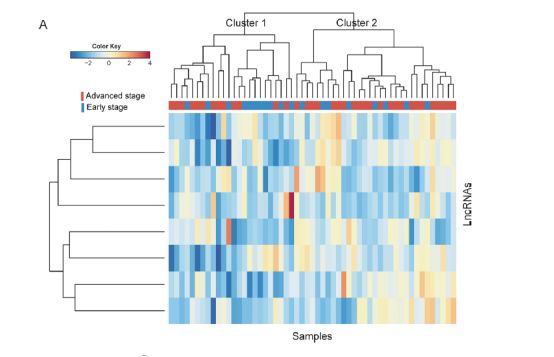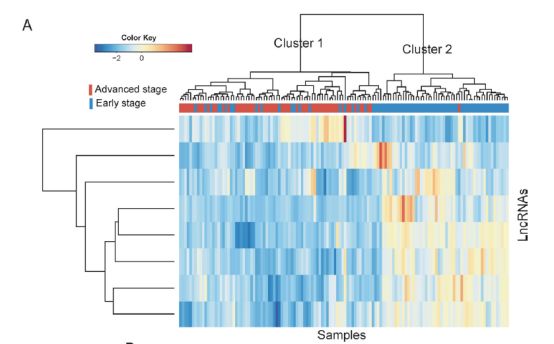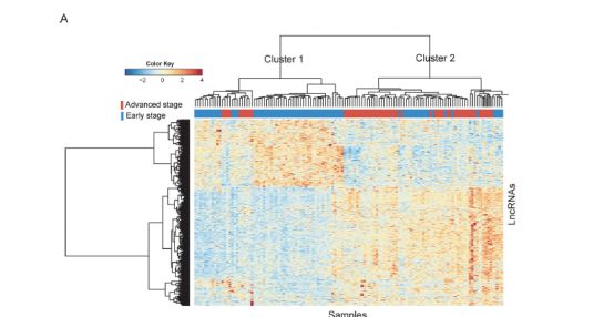 首先用第一个数据集GSE37892做了差异分析(分组是early stage Vs. advanced stage),找到几百个差异lncRNA,然后分层聚类分析下,明显分层两类,虽然有点点小瑕疵,效果还算不错。