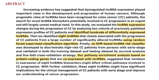 摘要部分看完大概知道文章找了些结直肠癌中差异的上百了lncRNA,后来从中缩小到了8个lncRNA,然后弄了一个基于SVM的风险分类模型来区分早期结直肠癌中的高风险病人,然后还做了通路富集分析啦。
