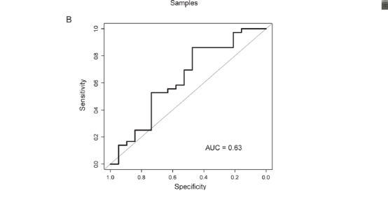 接下来要用外部数据集验证下了,称为Testing数据集,发现聚类结果还勉强吧,同样的ROC曲线评估下,AUC其实不是太好,但是还算勉强吧,这里同样可以有个两组的生存分析比较。