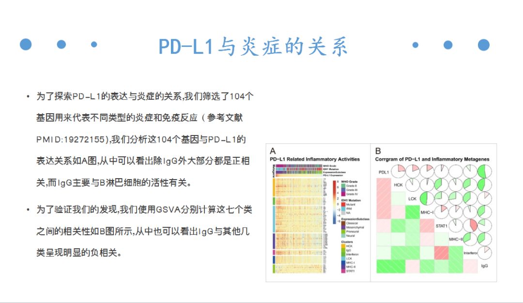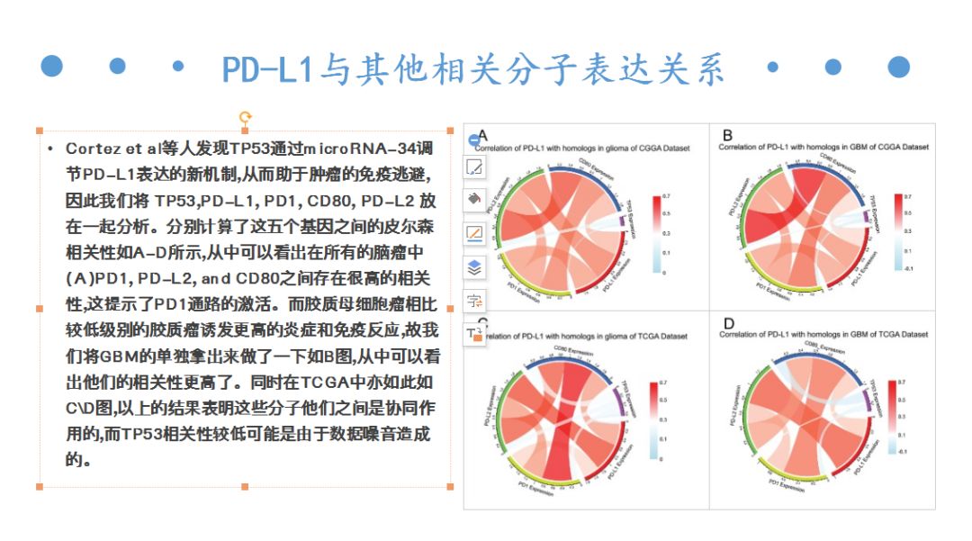 4、从胶质瘤已研究的相关的诊断分子和PD-L1相关的分子的表达与PD-L1的表达相关性出发,发现这些分子存在一定的协同作用