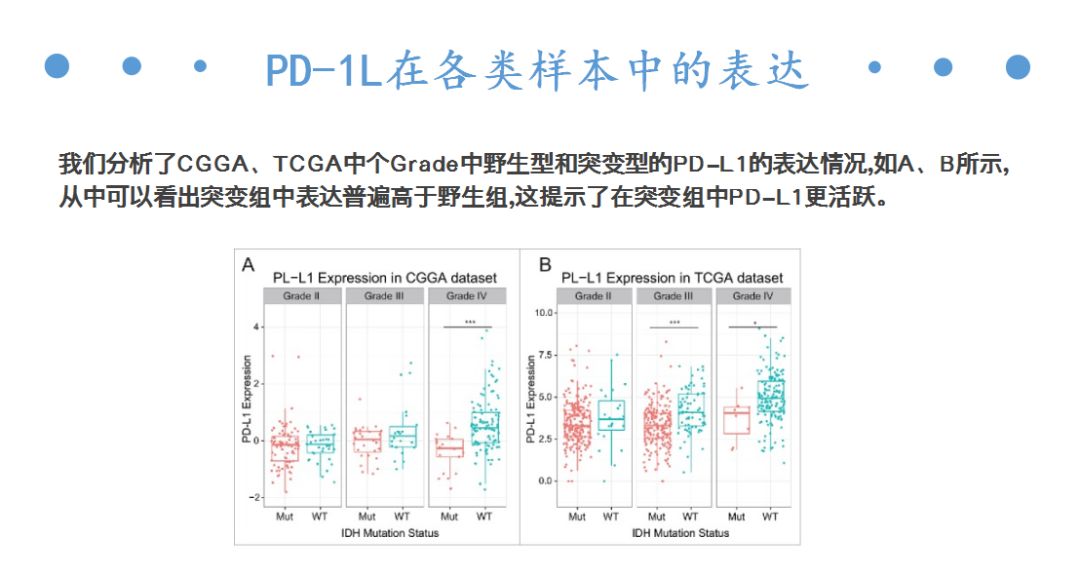 1、从明星分子IDH1突变上发现了不同的突变状态与PD-L1的表达存在相关。