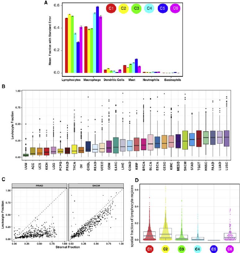 建立了泛癌肿(跨越不同组织类型和分子亚型)的六种免疫亚型;