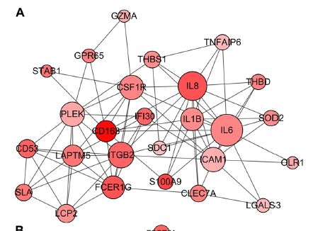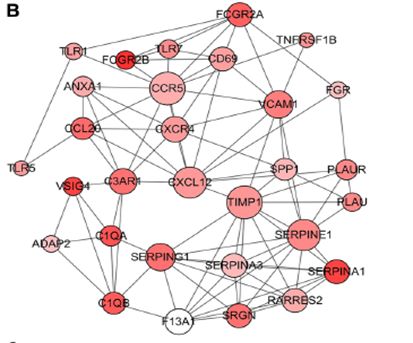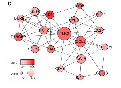• 几个免疫应答关键基因占据了模块的中心,包括TLR2,CCL2,CCL5,IGSF6和CD14等。