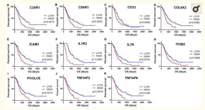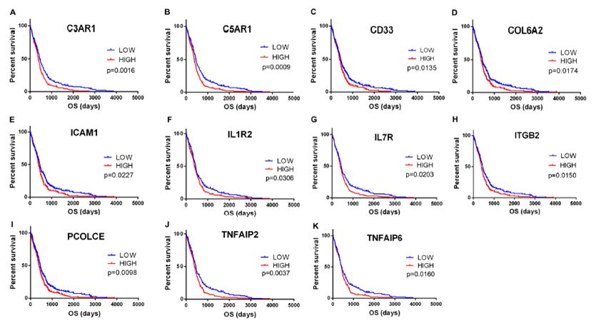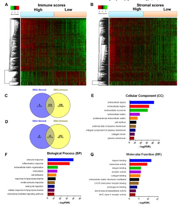 肿瘤微环境细胞和肿瘤中浸润免疫和基质细胞的程度对预后有显着贡献,在肿瘤微环境中,免疫和基质细胞是两种主要类型的非肿瘤组分,并且已被提出对于肿瘤的诊断和预后评估是有价值的;基于ESTIMATE算法计算的免疫评分和基质评分可以促进肿瘤中免疫和基质成分的定量;在该算法中,作者通过分析免疫和基质细胞的特定基因表达特征来计算免疫和基质评分以预测非肿瘤细胞的浸润;为了更好地了解免疫和基质细胞相关基因对预后的影响,我们可以系统的分析了肿瘤表达谱挖掘预后不良的肿瘤微环境相关基因,来挖掘其中潜在的调控机制。