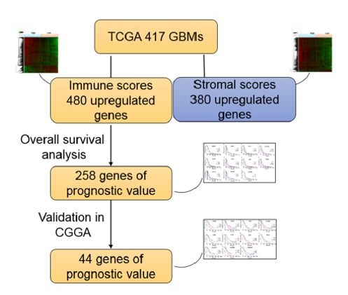 文章的基本思路是利用TCGA数据库和ESTIMATE算法衍生的免疫评分,构建GBM患者预后不良的微环境相关预后模型。