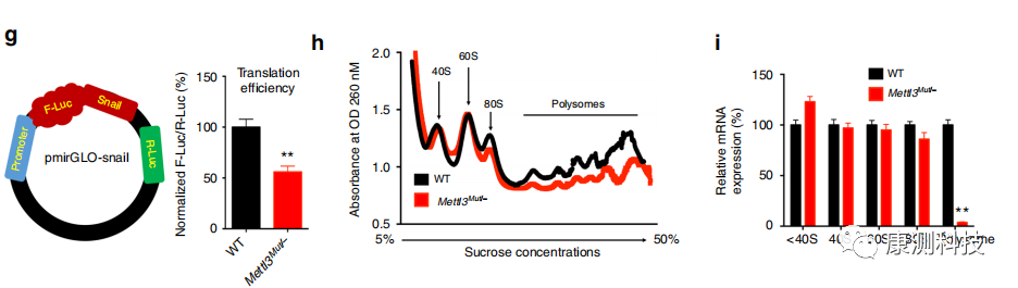(3)Ribosome Profiling实验结果表明,METTL3敲除之后,polysome的形成大幅降低,说明调控了翻译的延伸过程;