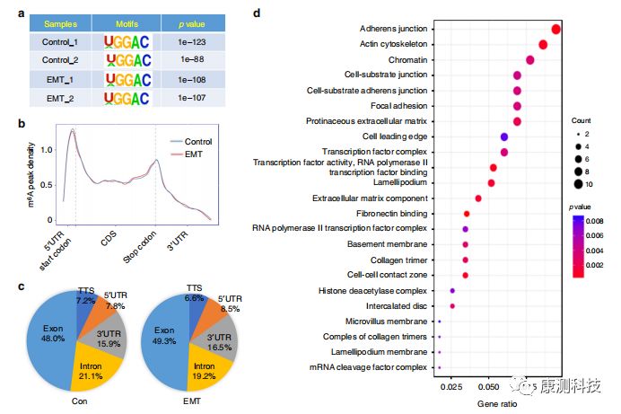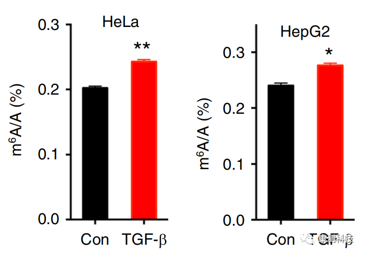 为了回答这个问题,作者使用TGF-b诱导包括Hela、HepG2等多种细胞的EMT,并使用LC-MS/MS对诱导前后RNA的m6A水平进行了鉴定。结果表明诱导之后,细胞内的m6A水平有了显著提高,说明EMT过程中m6A的修饰水平发生了显著变化。