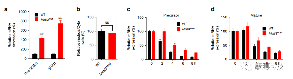 (1)qPCR实验验证pre-mRNA和mature mRNA的表达,发现METTL3敲除之后,两者的表达水平都有大幅上升