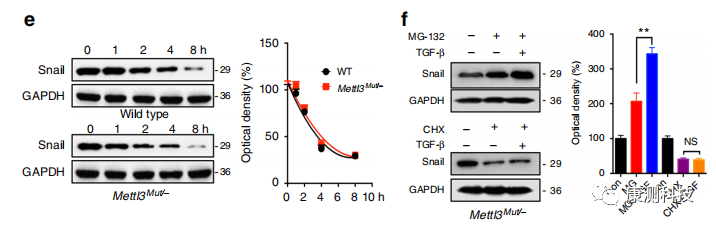 (1)蛋白稳定性实验结果表明,METTL3敲除前后对Snail蛋白的稳定性没有影响;