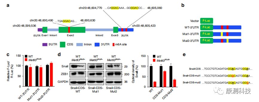 (2)Leuciferase实验表明METTL3敲除前后,Snail的转录水平没有发生变化;