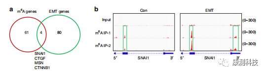 为了进一步缩小范围,找到主效应基因,作者将meRIP-seq中鉴定出来的EMT前后表达显著差异的84个基因和m6A修饰差异超过2倍的65个基因进行overlap分析,发现有4个基因EMT前后m6A水平发生了显著变化,同时表达水平也发生了显著变化,其中包括Snail基因。Snail是一个已知调控EMT的转录因子,因此作者接下来将研究的重点放在Snail上。