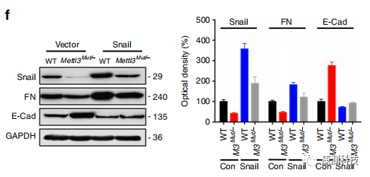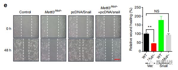 进而作者对Snail在EMT中的功能进行了验证,发现不管是从损伤修复能力还是EMT的蛋白标志物方面,Snail都可以促进EMT的发生,重要的是Snail过表达可以回补METTL3缺失引起的EMT deficiency。