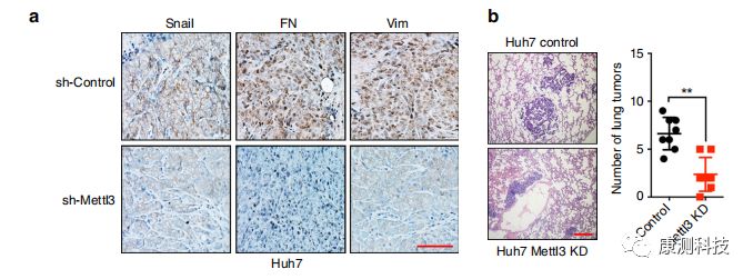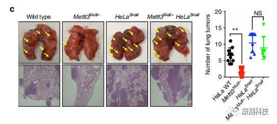 最后作者对METTL3-Snail通路进行了功能验证。作者将对照或sh-METTL3的Huh7细胞注射裸鼠,成瘤后对瘤组织进行IHC检测,发现METTL3敲低后,瘤组织中Snail,FN和Vim表达降低。为体内验证m6A修饰对细胞转移的影响,作者将HeLa WT,Mettl3Mut/- HeLa,HeLaSnail和Mettl3Mut/- HeLaSnail稳定细胞系注射到裸鼠中。结果表明METTL3敲低细胞的肺肿瘤数量显着减少;而Snail的过表达可以回补METTL3敲低的抑制作用,这表明Snail参与了METTL3的体内转移。