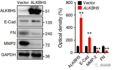 上述METTL3缺失对EMT影响的结果非常显著,但是作者尚不能确定是m6A水平降低引起的:因为METTL3虽然是一个甲基化转移酶,但它还有其他的生物学功能,因此无法将这些作用等同于m6A的作用。为了进一步确认是m6A的贡献,作者过表达了一个去甲基化酶ALKBH5,并对上述的标志物进行了检测,取得了和METTL3敲除同样的效果: