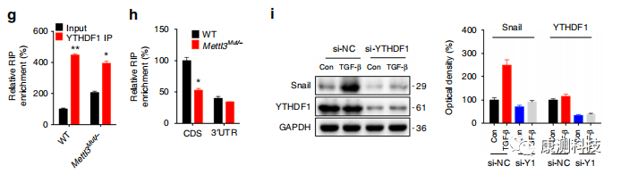 RIP-qPCR结果表明,YTHDF1可以强力结合Snail RNA,并且METLL3敲除之后,结合能力显著减弱;